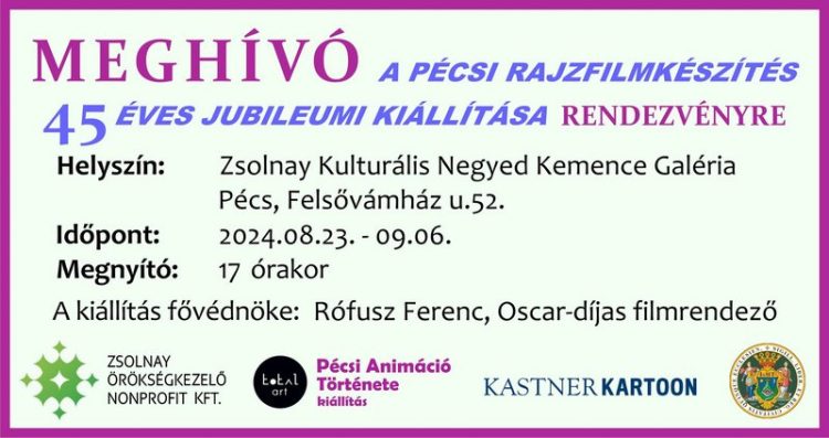 2024. augusztus 23-án 17.00 órakor nyílik a pécsi rajzfilmkészítés 45 éves jubileumi kiállítása Pécsett, a Zsolnay Negyed Kemence Galériájában.