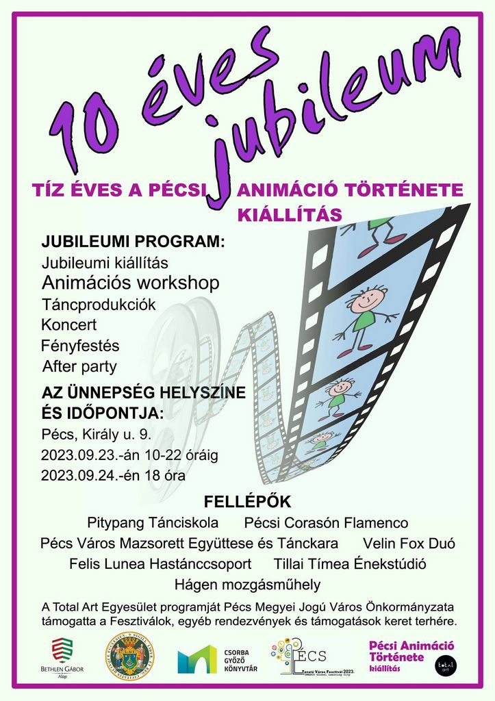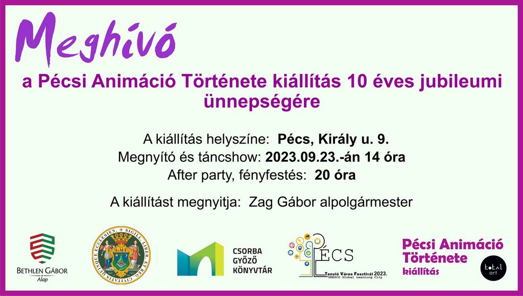 2013-ban, tíz évvel ezelőtt nyitotta meg kapuit a Pécsi Animáció Története kiállítás. Az interaktív kiállítás átfogó képet nyújt a látogatóknak az animáció-készítés műhelytitkairól, a Pécsett készült animációs filmekről. A kiállítást működtető Total Art Egyesület tagjai az elmúlt tíz év alatt számtalan kulturális programot valósítottak meg Pécsett, valamint vidéki helyszíneken és határon túl egyaránt. Kiállítások, koncertek, könyvbemutatók, zenei estek, író-olvasó találkozók, konferenciák, animációs workshopok, tanfolyamok szerepeltek a palettán.